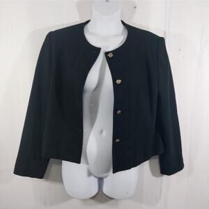 From Worthington comes this stunning 100% wool dress jacket, blazer, in rich, deep black! Featuring a four button front with gold metal inset insignia buttons, a boxy Ch*nel inspired shape, shoulder pads, and 3" slit sides! Fully lined in black poly satin! Size 18, worn twice! Excellent! Superb EUC Condition! ***ABSOLUTELY GUARANTEED CONDITION: EUC MINTY-EXCELLENT TO LIKE NEW, by Lily @HauteClub!*. Offers welcomed!***