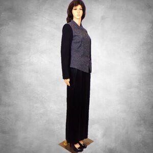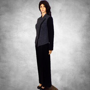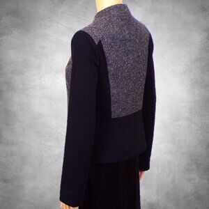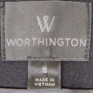 THIS HANDSOME TWO-TONE (BLACK AND GRAY) ZIP-FRONT LIGHT JACKET BY WORTHINGTON, SIZE S, is gently pre-owned, in near-perfect condition, free of defects or damage, with no signs of wear. It has lightly padded shoulders, no collar or lapels, and a lining of lustrous black 100% polyester fabric. The zipper is canted a few degrees off the vertical axis and offset to the left, with a black accent strip up its left side. Up close, the gray portion of the jacket is seen to be a composite of several colors, chiefly gray, green, and white. The gray portion of the outer fabric is polyester 79%, rayon 19%, and spandex 2%. The black is polyester 73%, rayon 23%, and spandex 4%. The stated size is S, but prospective buyers are encouraged to compare the measurements with those of a jacket that they know fits well prior to purchase. Measurements are: chest, pit to pit 17.75"; waist 16"; hemline 17.75"; shoulder 15"; sleeve 23.75"; length (in back, neckline to hem) 22"