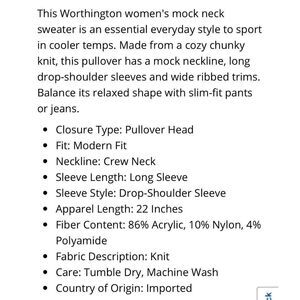 This Worthington women's mock neck sweater is an essential everyday style to sport in cooler temps. Made from a cozy chunky knit, this pullover has a mock neckline, long drop-shoulder sleeves and wide ribbed trims.