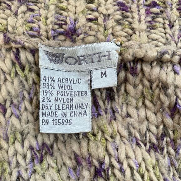 WORTH clothing- size medium- Beautiful multicolor snap closure long cardigan. Size medium. Beautiful buttons. 41% acrylic 38% wool 19% polyester and 2% nylon. RN 105896