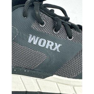Sleek, stylish WORX Athletic Safety Steel Toe Shoes in women's size 7.5W. Black and gray design. Features shock-resistant, lace-up style and padded tongue and collar. Rubber sole ensures maximum slip and heat resistance.