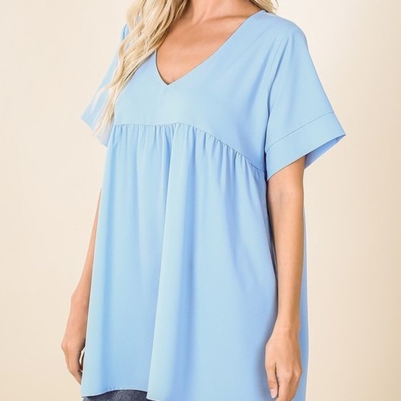 WOVEN HEAVY DOBBY EMPIRE WAIST SHIRRING TOP - RELAXED FIT - BEST QUALITY WOVEN - NO SEE-THROUGH SHORT SLEEVES