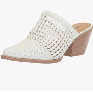 Slip into the quinton western style mule by SEVEN DIALS shoes. This casual heel has a beautiful airy open weave upper construction, elevated by an angled block chunky heel and finished with a pointy toe. Heel height 3 inches.