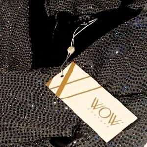 Stunning asymmetrical dress by WOW Couture. Features a shimmering silver design. Perfect for a night out.