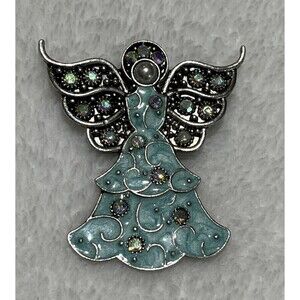 This vintage enamel Christmas angel pin/brooch is a fantastic addition to your holiday jewelry collection. The angel's wings are beautifully detailed and the colors are perfect for the season. The round rhodolite stone adds a touch of elegance to the piece, which is made of resin and has a channel-set setting style. It measures 2.25 inches in length and is perfect for women who want to add a touch of festive cheer to their outfits. This pin/brooch is an original piece and is not signed or modified. It would make a great gift for anyone who loves unique and vintage jewelry.
