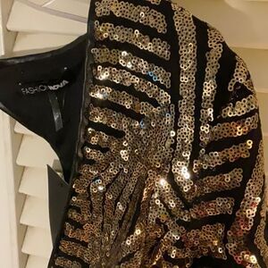 Going ice skating ⛸️ or dancing 💃 🪩 Shorts. Black and Gold hot pants jumper. Lined. Ready for Fun. Dare to wear this deep V or put it over your lace. Get Sparkly! Ready for the Holidays or that special occasion or date night. Measuements are in pictures which are part of description. Arm pit to armpit 18”. Waist 14” across slight stretch hot pants have 2” inseam curve hugging. Wear with tights too!