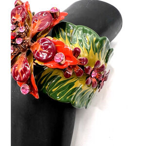 WOW! Y2K Enamel Rhinestone Poinsettia Hinged CufF Christmas Bracelet Red Green
