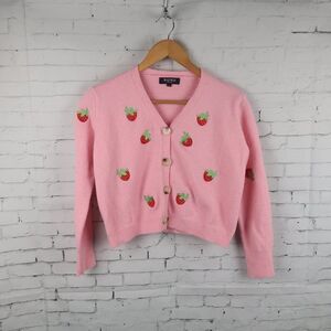 PINK WITH EMBROIDERED STRAWBERRIES LONG SLEEVE BUTTON DOWN CROPPED CARDIGAN SWEATER SIZE SMALL BY WOWO PRE OWNED NO FLAWS