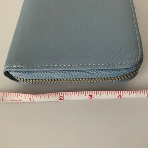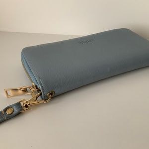 WOZEAH Women’s Large Wristlet/wallet with zip around. Color: Grey (grey/blue). Faux Leather. Material: Polyurethane durable leather. Removable wrist strap. Wallet has credit card slots, an ID window with central cut out over, a zipper pocket for change, currency pockets, a pen loop. Great Wallet for yourself or a gift. Please see pics for details.