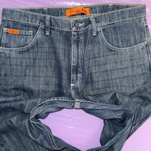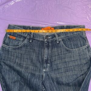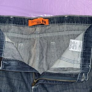 WRANGLER 20X FR Blue Denim Jeans with Orange Label.