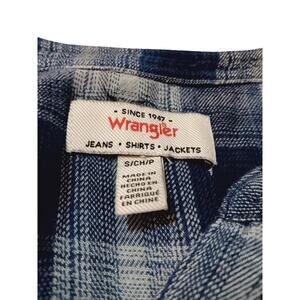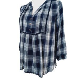 WRANGLER Boho Peasant Top Blouse Flowy Small Plaid Yoke Crochet Blue Casual