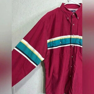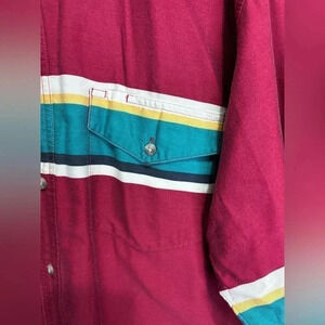CLASSIC WRANGLER SHIRT, COTTON, WESTERN STYLE, LONG SLEEVES, BUTTON-UP, HORIZONTAL STRIPES ACROSS CHEST & SLEEVES, RED/TEAL/WHITE/YELLOW/BLACK