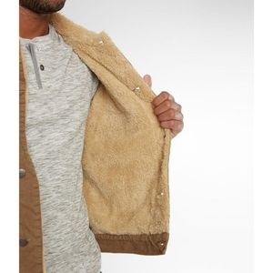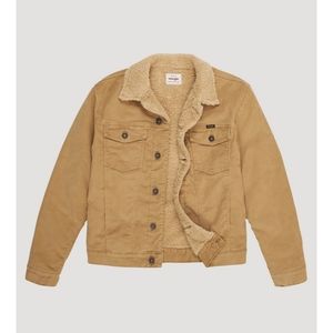 •Size:L, XL and XXL •Beige/khaki color •NWT Winter weather doesn't stand a chance against this stylish Wrangler® men's sherpa-lined corduroy trucker jacket. The style is equipped with warm sherpa lining and a comfortable corduroy exterior for double the warmth and an understated vintage vibe. The corduroy sherpa jacket has a classic 4-pocket style with twin chest flap pockets and our signature 'W' stitching. Stay warm and in style this season—layer this jacket over your favorite crewneck sweatshirts for a casual look you can wear any day of the week. •Khaki corduroy fabrication •Sherpa collar and lining •Long sleeve length •Four front pockets •Two single-point flap pockets on chest with signature embroidery •Button-down placket, chest pockets and cuffs •Wrangler logo patch on front •Straight back yoke •Spread collar •Single button cuff •Machine wash cold, tumble dry low