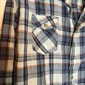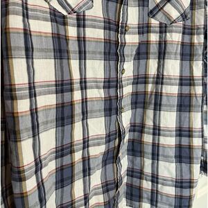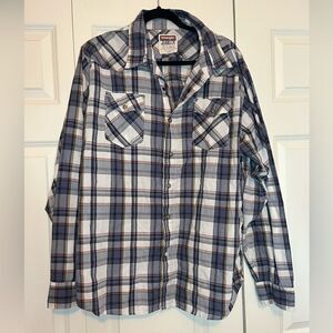 This is in great condition. A beautiful men’s plaid Wrangler brand button up shirt. This is perfect for any guy to wear out!