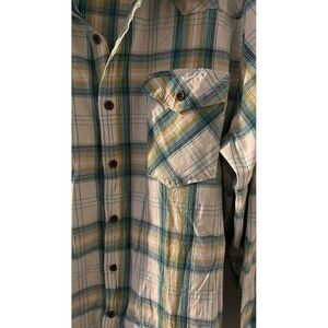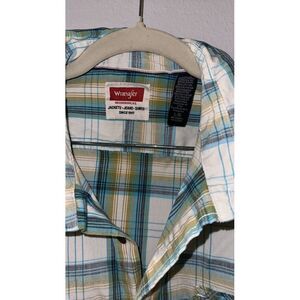 Introducing a stylish and comfortable Western shirt from Wrangler. This shirt features a plaid pattern in aqua and yellow colors and is made of a soft cotton blend material. The shirt has long sleeves with button cuffs and a collared neckline with a button-down style. It also includes convenient pockets for storage.