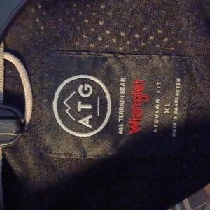 WRANGLER, ALL TERRAIN GEAR, REGULAR FIT, SIZE XL. LONG SLEEVE, BUTTON UP, ONE FRONT POCKET, WITH HIDDEN ZIP POCKET. MEASUREMENTS ARE BELOW APPROX.