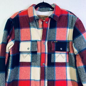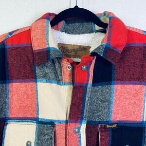 WRANGLER Shacket Jacket Chore Barn Coat Plaid Sherpa Lined Pearl Snap Logo Pocket