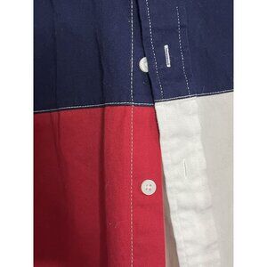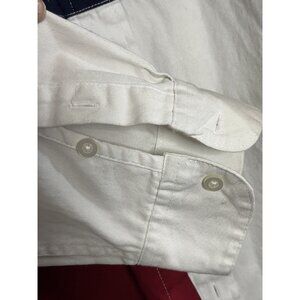Very gently used; you will see expected wear on the back w/ the tuck, & that is all. No rips, tears or issues with the fabric or buttons. Just as bright as the day it was made!