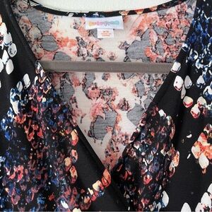 Very stretchy and comfortable wrap dress by LuLaRoe. Hits just above the knee with sleeves that end at the elbow. Unique snake print in black and white and shades of blue and rust.