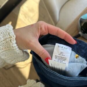 Details: WRAP London High Rise Wide Leg Jeans - Size: 8 - Color: Indigo Blue - Material: 94% Cotton, 5% Polyester, 1% Elastane- Features: High Rise waist, denim, dark wash, wide-leg, raw hem, zipper fly with button waist, 5-pocket styling, belt loops, stretch, machine wash, comfort, breathable, casual. Stock image created by AI.