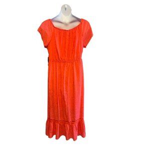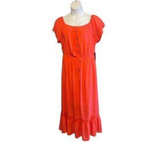 This stunning maxi dress from Wrapper is a must-have for any fashion-forward woman's wardrobe. Featuring an off-the-shoulder neckline with button Lace accents, this dress is perfect for any occasion, whether it be a casual day out or a formal event. The dress is made from a lightweight and comfortable fabric, is lined with an elastic waist, Button down top and adjustable puff sleeves for added comfort and style. You can choose to go off shoulder or on. Coral Orange color that is perfect for the summer, fall, and spring seasons.