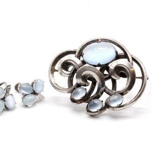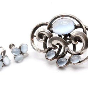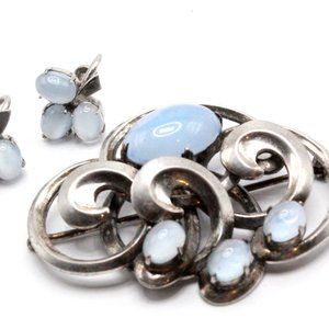 WRE Signed Sterling Silver Faux Moonstone Cabochon 40's Brooch Demi Set