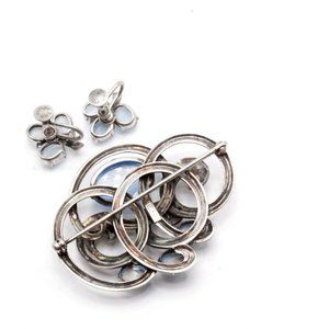 Embrace the timeless charm of this vintage jewelry set, meticulously crafted by W.R.E. during the 1940s. The brooch, a true masterpiece, is expertly fashioned from sterling silver, featuring mesmerizing swirling designs adorned with captivating powder blue faux moonstone cabochons. Complementing the brooch flawlessly, the earrings boast the same exquisite materials and composition. Marked with "WRE" and "STERLING," this set showcases slight tarnishing that adds a touch of vintage allure. The brooch measures 2 1/4" in length and 1 3/4" in width, while the earrings are 3/4" long and 1/2" wide, making this set a perfect embodiment of elegance and sophistication.