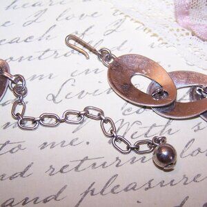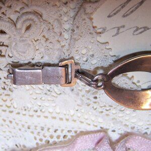 From the firm of WRE aka W E Richards (makers of Symmetalic jewelry as well), may I offer this Sterling Silver (hallmarked as pictured) jewelry set consisting of a matching necklace and bracelet. With a length of 7" to the bracelet, the design is of a grooved, slightly oval, teardrop shape. The links overlap one another and end in a fold over catch. Width of the bracelet is 11/16"; weight is 23.2 grams. The necklace has a length of 16" and has a "hook and eye" closure. Width of the links is the same as the bracelet and the weight is 49 grams. Very nice condition with a mellow patina to the silver. A wonderful pair of pieces that could be left as is, combined to make a larger necklace or repurposed into another design. NOTE: Only the bracelet bears the WRE hallmark. 7675RV*
