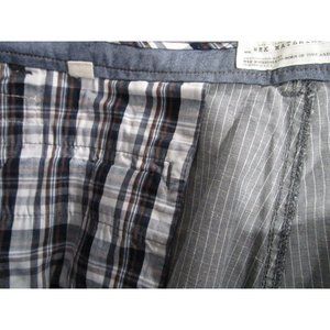 Elevate your casual style with these upscale men's shorts from WRK Materials Co. Made from a luxurious linen-cotton blend, they feature a sophisticated gray stripe design. In excellent used condition, these shorts are a size 40. Metal zipper. Cotton plaid pocket lining. Blue and gray chambray waist lining. Designed in USA.