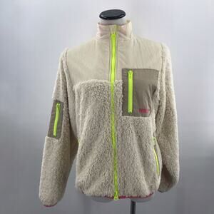 Keep warm and cozy in this fuzzy jacket. It's lined with breathable mesh and has zip pockets for easy storage. Eco sherpa fabric. Fluffy look. Soft and cozy finish. Full length. High neck. Features a functional zipper at the front. Locker loops. 2 zip pockets on the body. Elasticated hem and sleeves. Made from sustainable material. Recycled polyester. In preowned condition.