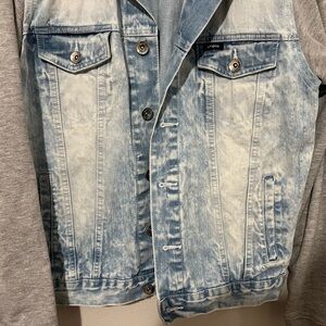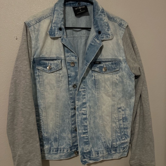The WT02 Men's Light Wash Denim Jean Jacket with Sweatshirt Material Sleeves in size Medium is a stylish and versatile outerwear piece for men. (8)
