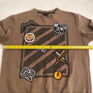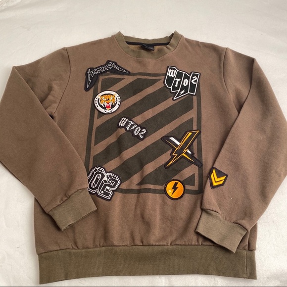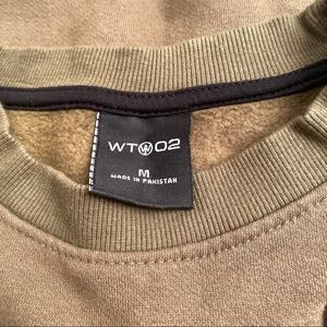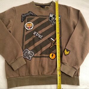WT02 olive crew neck pullover sweatshirt with patches and graphics down sleeve. Soft. Unisex. Excellent condition. Smoke free home