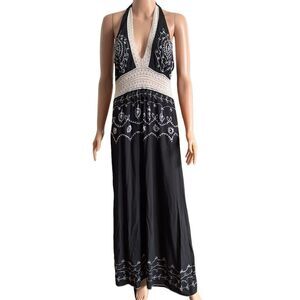 WUWATI Black Lace & Embroidered Haltered Backless Maxi Dress MEDIUM