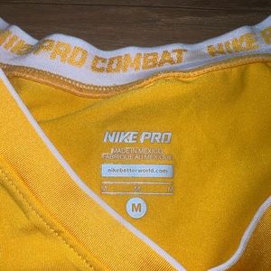Golden, compression workout top from WVU Women’s Rowing team. This top has no flaws, and fits true to size. However, it would still fit a size S but probably not as form fitting.