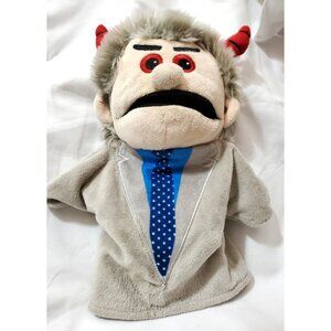 Soft gray fabric suit with stuffed plush head with shaggy gray hair & red devil horns.