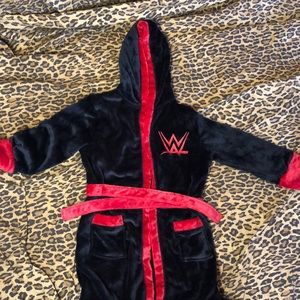 This black and red robe is great for any little wrestling fan! It’s so cute and cozy. The black and red coloring stands out and is perfect to put over jammies or over a wrestling gear. Never been worn however there are no tags.