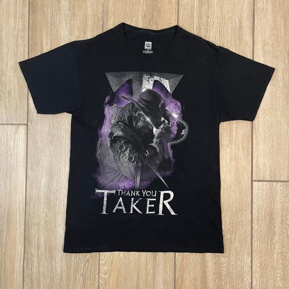 Official WWE Authentic The Undertaker “Thank You Taker” graphic t-shirt featuring a bold tribute design in purple and gray on black.