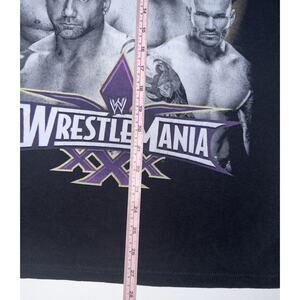 Take home a piece of wrestling history with this Wrestlemania branded men's t-shirt. Featuring iconic wrestlers such as Undertaker, Cena, Brock, RKO, and Bautista, this black tee is perfect for any fan of the WWE WWF. Sized as a medium for regular fit, this shirt is a great addition to any collection. The black color and classic design make it versatile for any outfit or occasion. Don't miss out on your chance to own a piece of wrestling nostalgia.