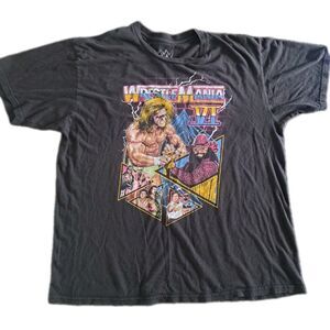 WWE WrestleMania mens T-shirt, size XL, black. Features retro wrestling graphic with Ultimate Warrior, Macho Man, Bret Hart & Jim Neidhart, Roddy Piper, Big Boss Man, Barber Beefcake, and Jake The Snake Roberts.