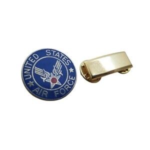 This is an Air Force crest pin featuring the star and wing design. The pin is designed with enamel detailing in gold and blue, with wings and a star with a second pin of a plain gold tone band.