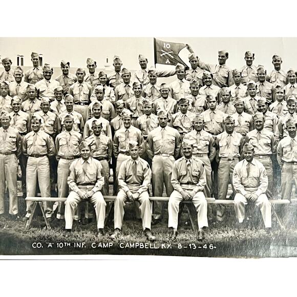 Capture a moment of American military history with this authentic vintage black-and-white photograph of Company A, 10th Infantry Regiment, taken on August 13, 1946, at Camp Campbell, Kentucky (now Fort Campbell). During World War II, the 10th Infantry Regiment was assigned to the 5th Infantry Division and saw extensive combat in the European Theater, participating in major campaigns such as Normandy, Northern France, the Rhineland, the Ardennes (Battle of the Bulge), and Central Europe. The image features a full company of U.S. Army soldiers posed in uniform under the command of Captain Kirk E. Adams, just months after the end of World War II.