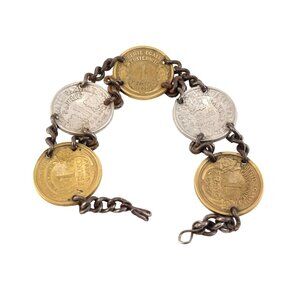 This stunning bracelet is crafted from authentic vintage French coins, featuring both brass and silver tones. The adjustable chain link design makes it a versatile fit, allowing for a comfortable wear. Each coin tells a story and adds a unique historical touch to your jewelry collection.