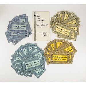 The game title itself, Take It or Leave It!, speaks to the urgency and excitement of the era, and the game's theme of quiz trivia is sure to challenge players of all ages. Made in the United States, this game is a unique addition to any collection and is a great way to learn about the past. Don't miss out on the opportunity to own a piece of history with this WWII Take It or Leave It! Try for the $64 question trivia game.
