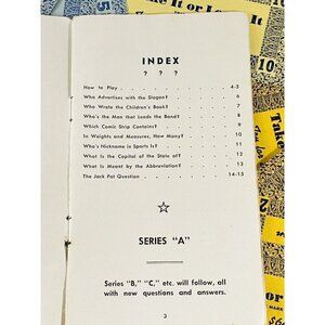 Experience the nostalgia of the 1940s with this vintage “Take It or Leave It!” Series “A” trivia quiz game from Zondine Game Co. (?), abased on a popular radio show. Test your knowledge with this WWII era quiz game that features questions related to history, culture, and everyday life. This game is perfect for game nights and is sure to provide hours of entertainment.