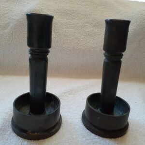 I believe these are WWII trench art shell candle sticks/holders, I polished the bottom so I could read the numbers, one says 44 FSC LOT - 1 40 MM and some other letters I can't read, the polished bottom looks brass and they are non-magnetic. The other one says 40 MM - MK and some other letters. They have been used as candle holders, there is some wax on them. They weigh almost 2 pounds. Please ask questions.