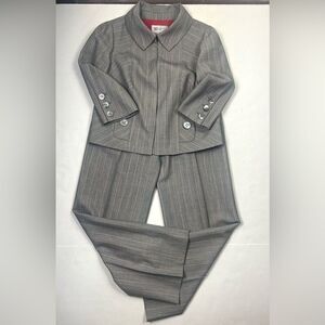 In excellent used condition W Worth Wool Pantsuit. Featuring a cropped blazer with 3/4 sleeves. Beautiful grey suit with white and pink stripes and front button and clasp closure and 2 front pockets. Pants are a nude rise and sit right on the waist and 2 faux pockets. Fully lined pants and blazer.