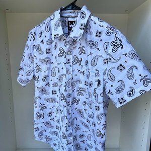 A white stunner with black bandana designs! This shirt is all about turning heads and making a statement. It's sized as a medium, but runs a bit small for a sleek fit. Crafted from comfortable cotton, it's perfect for any occasion. The striking black bandana designs on the white fabric add an urban flair. In brand new condition, this shirt is ready to make heads spin with envy. Get your hands on this fashion-forward piece and embrace your inner style guru. Order now and let the adventures begin!