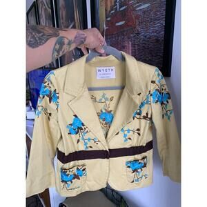 WYETH BY TODD MAGILL Blazer Jacket size medium, preowned great condition. Yellow with brown & blue embroidered florals. 97% cotton 3% spandex. 19 in pit to pit, 20 in top to bottom/ ships in 1-2 days 🧚♀️🧚♀️