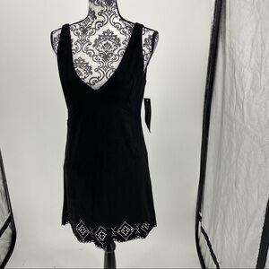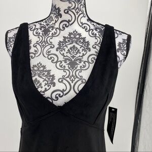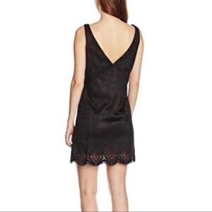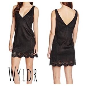 WYLDR fun night out little black dress. Faux suede made from 100% polyester. Bottom has laser cut geometric pattern cut out. Fully lined. Triangle style bust. Wide straps. V-back. Bodycon fit. Pullover. Size small.