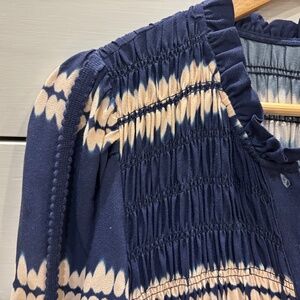WYSE London Aggie Shiburi Dress, Midnight/Ivory. WYSE size 1R (corresponds to US size 4). Smoked bodice with button through placket. Navy ric-rac trim down each sleeve. Super comfortable. Excellent condition (only wore once).